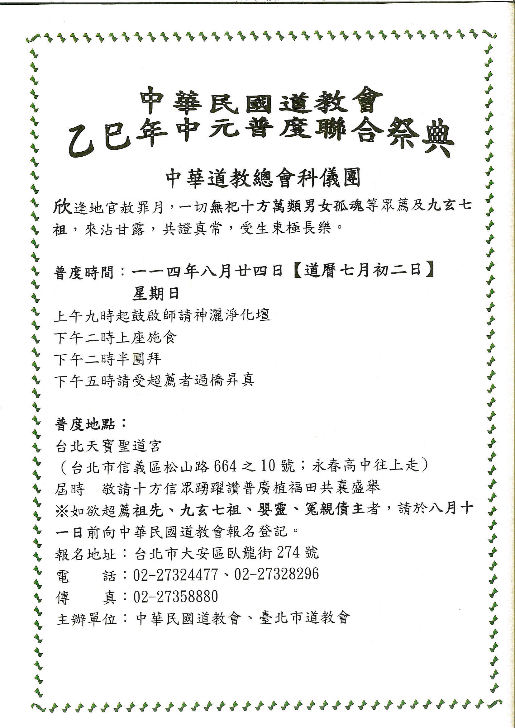 本年度乙巳歲慶讚中元普度聯合祭典。訂於八月廿四日(農曆七月初二日)星期日上午九時起,假台北天寶聖道宮(台北市信義區松山路664之10號),設壇啟修慶讚中元普度濟幽道場一永日,屆時務請撥冗參與。